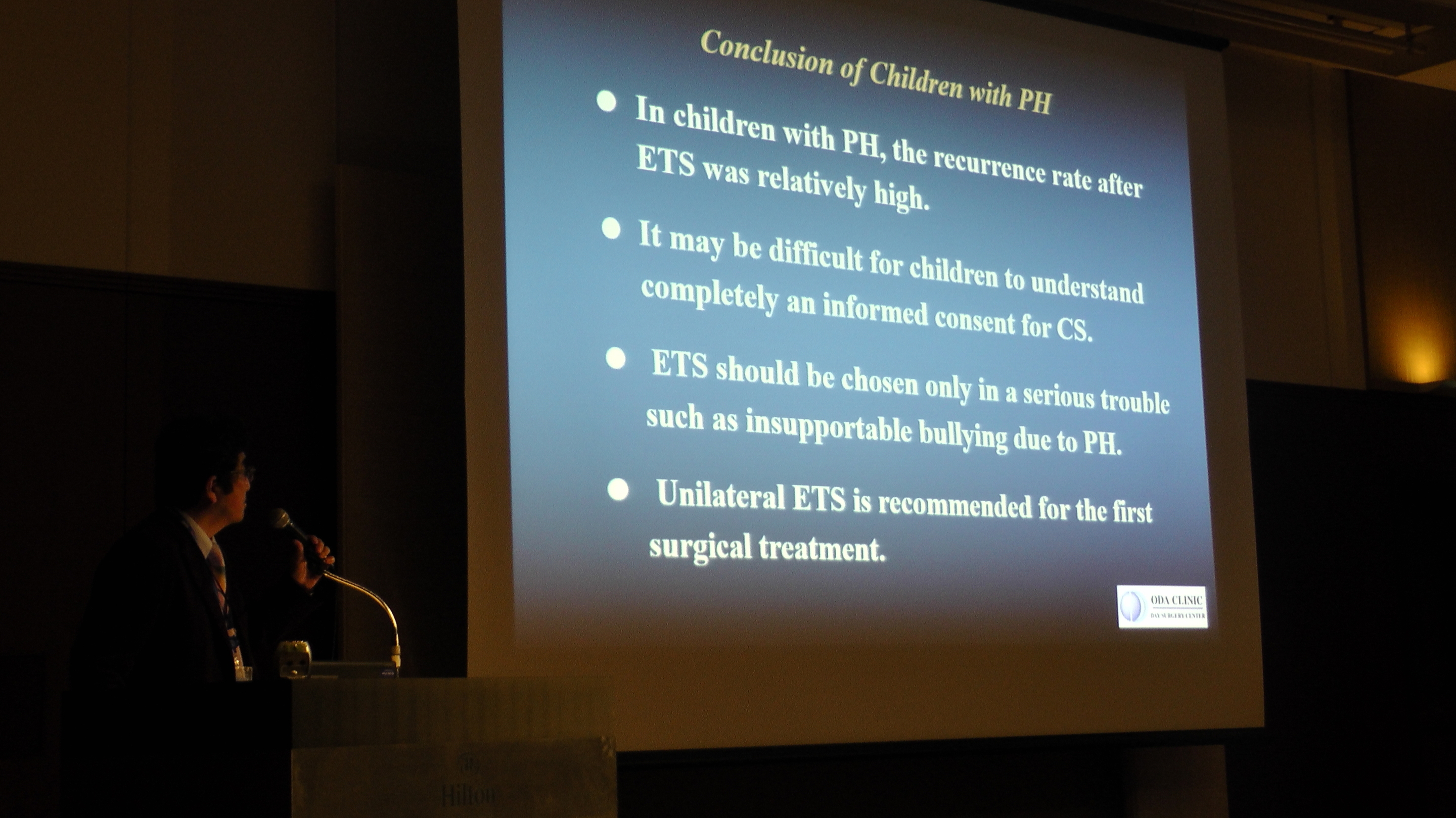 2年ごとに開催される多汗症治療に関する国際学会です.今年はおだ院長が福岡で開催しました.世界各国から専門医が集まり,現時点での最も進んだ多汗症の治療法と治療成績が発表されました.会場のヒルトン福岡シーホークには海外参加者に溢れ,さらに日本からは生理学教授,神経内科専門医,皮膚科専門医が多数参加し,多汗症の基礎的メカニズムの研究など,将来の展望についても議論されました.おだ院長は低位交感神経遮断(T4-ETS)の効果に関して基調講演と高齢者・小児の多汗症治療に関する教育講演を行いました.また日本の各医療機関での多汗症治療の現況に関するセッションで座長を務めました.